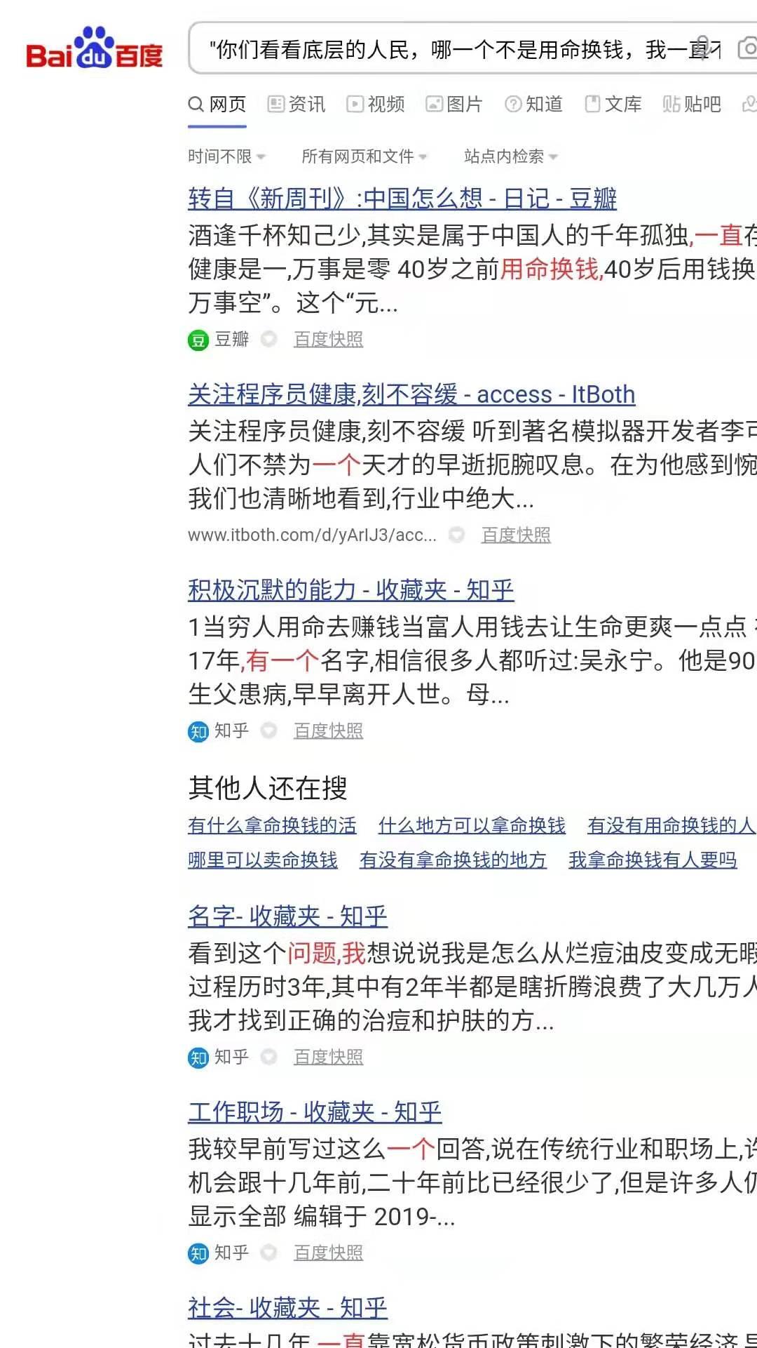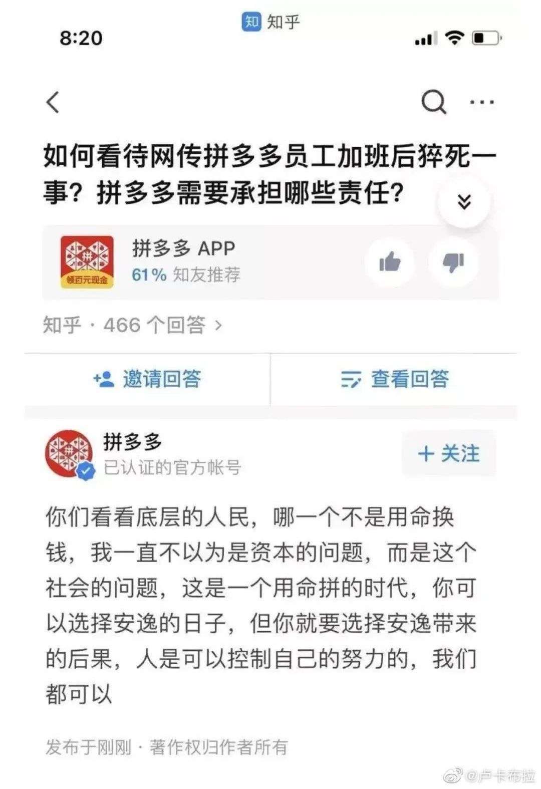 4 日 8 时 19 分 49 秒,「拼多多」创建回答「你们看看底层的人民,哪一个不是用命换钱,我一直不以为是资本的问题,而是这个社会的问题,这是一个用命拼的时代,你可以选择安逸的日子,但你就要选择安逸带来的后果,人是可以控制自己的努力的,我们都可以」。