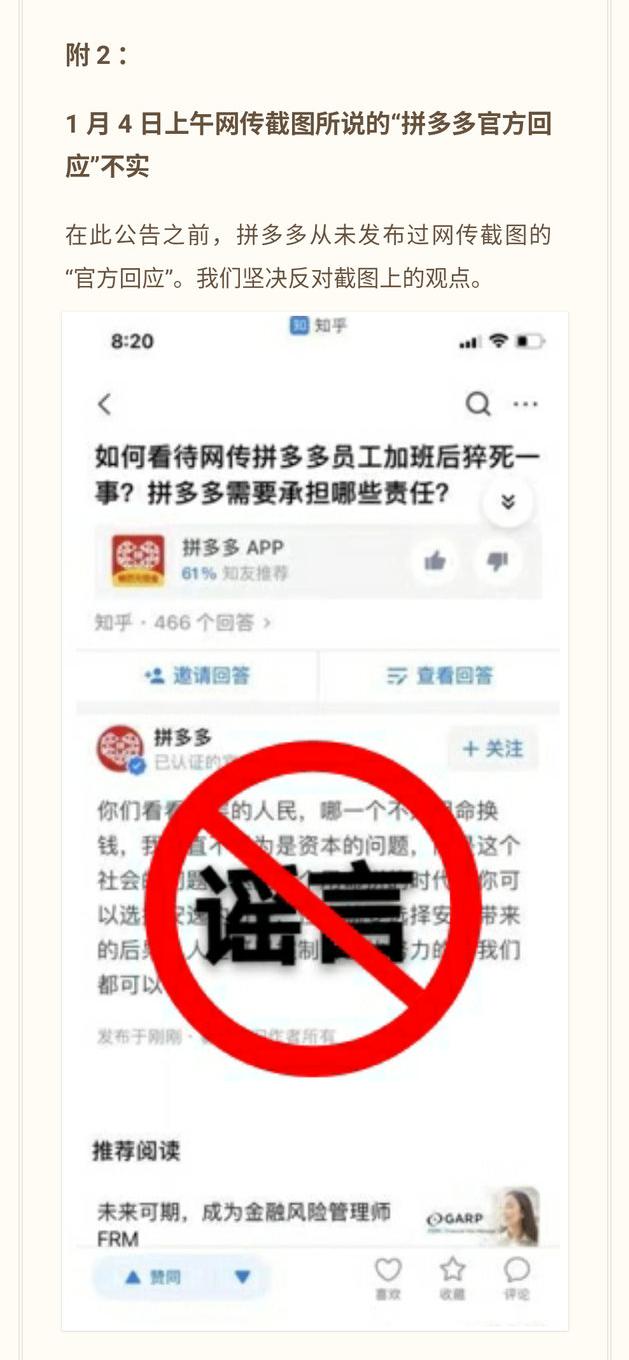 当天下午,拼多多发布一则《关于拼多多同事张*霏意外离世的说明》,不过没有选择微博、微信、知乎等官方社交媒体发出。这则《说明》是通过媒体流出来的,其中那张“你看看底层的人民,哪一个不是用命换钱”的回答截图被打上了一个大大的“谣言”戳记。