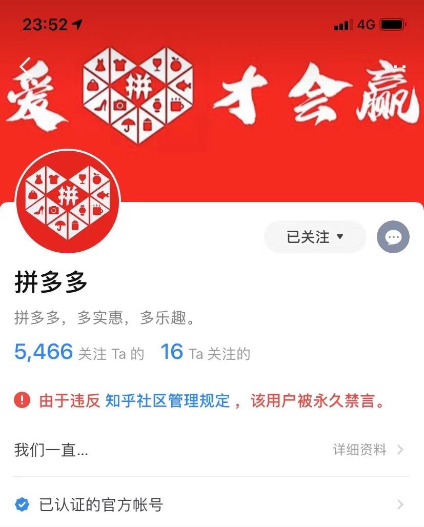 在 5 日 0 点前后,“拼多多”在知乎的认证账号被知乎站方永久禁言,依据是: