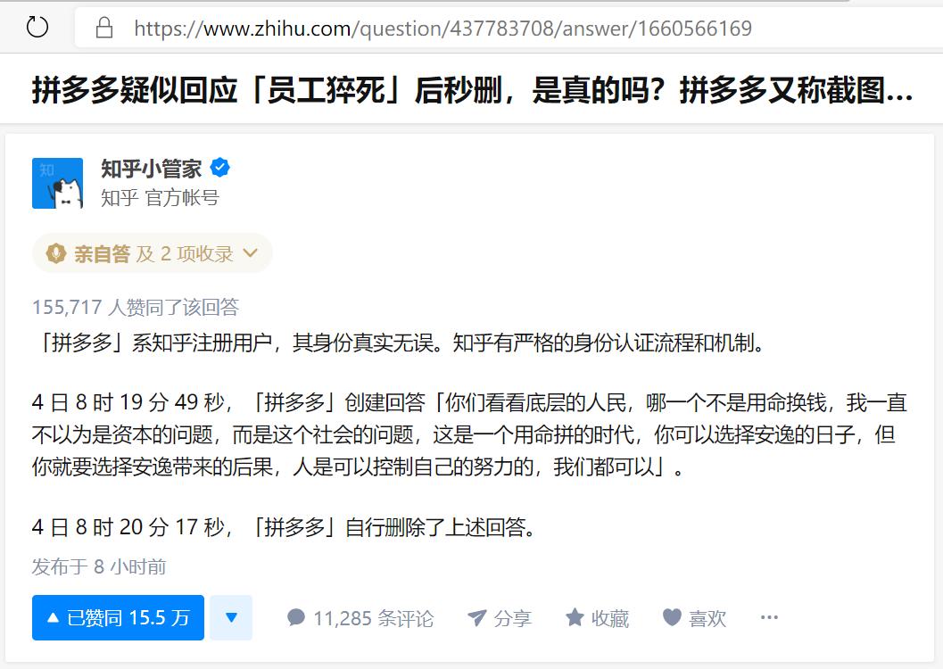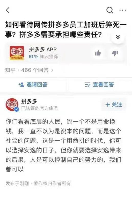 这一天里,网上广泛流传一个知乎问答的截图,图上“拼多多”认证的官方账号,仅用短短几句话就引起了舆论哗然: