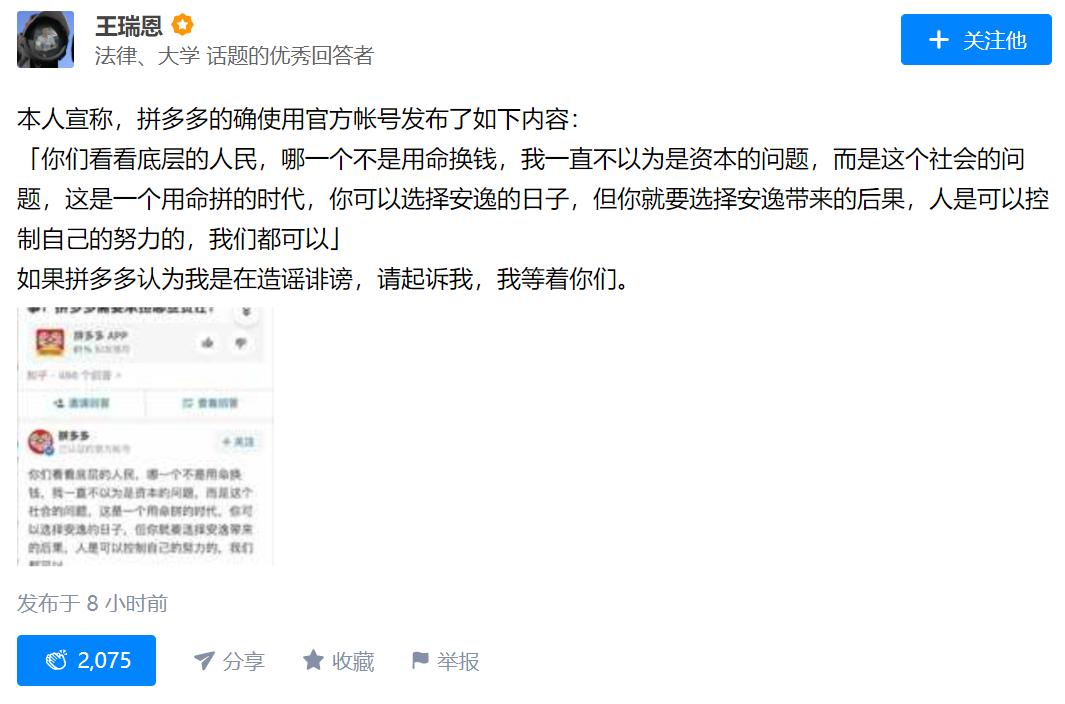 “本人宣称,拼多多的确使用官方帐号发布了如下内容:「你们看看底层的人民,哪一个不是用命换钱,我一直不以为是资本的问题,而是这个社会的问题,这是一个用命拼的时代,你可以选择安逸的日子,但你就要选择安逸带来的后果,人是可以控制自己的努力的,我们都可以」如果拼多多认为我是在造谣诽谤,请起诉我,我等着你们。”