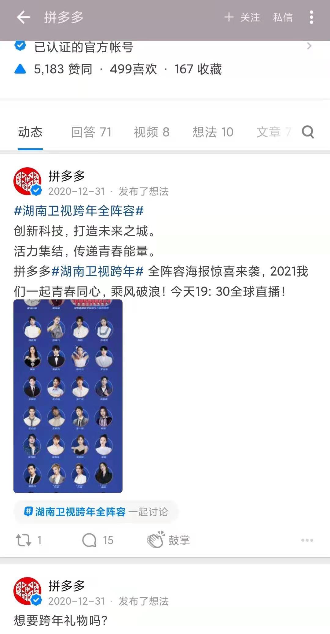 没有任何办法证实“拼多多”曾经发布过这条消息。它在知乎的主页一切正常,更新停留在上一年,评论区还有陆续进入吃瓜的群众问“你们的小编这几天怎么不发东西啊”。