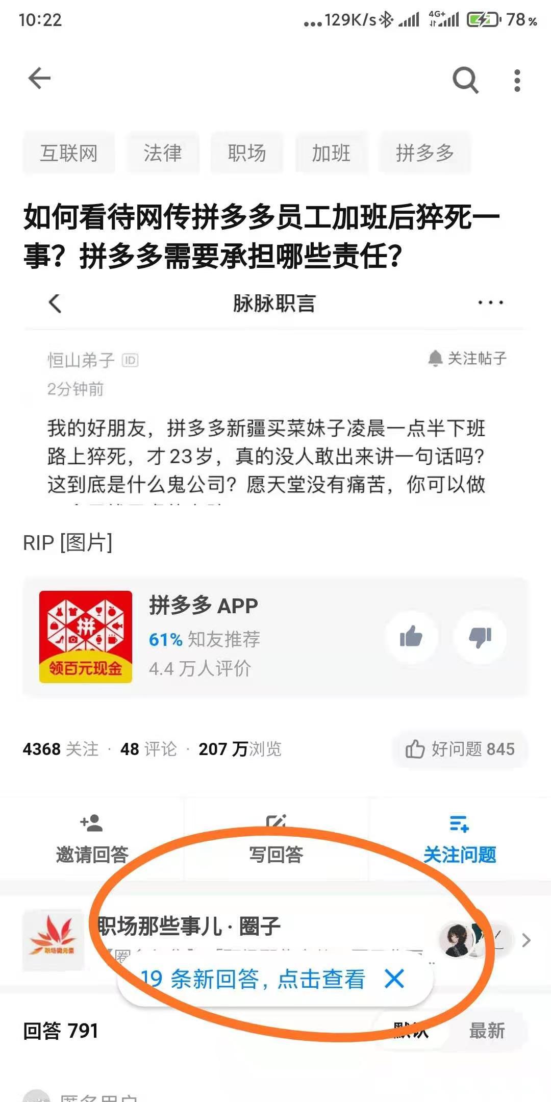 当时,拼多多员工突然死亡的话题已经登上知乎热榜,相关问题在电脑网页版和 App 端都有足够展示,在截图开始流传的早上 10 点 22 分,相关问题已经有 791 条回答。