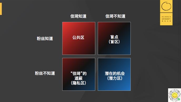 右下是李佳琦不知道,粉丝也不知道,是他们彼此沟通当中的盲区,也叫做潜力区。