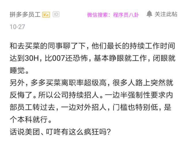 “和去买菜的同事聊了下,他们最长的持续工作时间达到30H,比007还恐怖,基本睁眼就工作,闭眼睡觉。另外,多多买菜离职率超级高,很多人路上突然就反悔了。所以公司持续招人。一边半强制要求内部员工转过去,一边对外招人,门槛也特别低,是个本科就行。话说美团、叮咚有这么疯狂吗?”