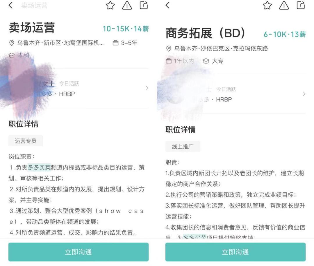 BOSS直聘上的多多买菜乌鲁木齐招聘信息中了解到,卖场运营10-15k·14薪;BD6-10K·13薪。