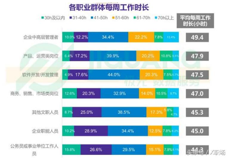 《2018年中国程序员研究报告》显示:产品运营类岗位平均每周工作时长47.9小时,其中工作50个小时以上的占36.5%,其中70小时以上的占5.5%。根据受访的程序员统计,其每周平均工作时长为47.5小时。其中,33.5%的程序员周工作时长在50个小时以上,更有工作时间在70个小时以上的,占5.7%。
