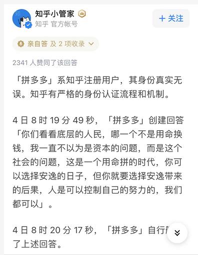 该回应发布不久,知乎官方微博发文表示:“拼多多”系知乎注册用户,其身份真实无误。知乎有严格的身份认证流程和机制。