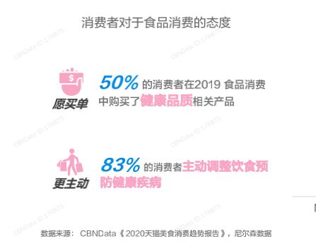 国民健康意识逐步提高,超九成公众认为身体健康是首位重要的事;公众的健康自评刚到及格线水平,其中年龄越小,对健康状况越不自信,当代年轻人也有健康苦恼,80后、90后更是面临着职场及生活的双重压力。根据CBNData《2020天猫美食趋势报告》显示,50%的消费者在2019年食品消费中购买了健康品质;83%的消费者主动调整饮食预防健康疾病。