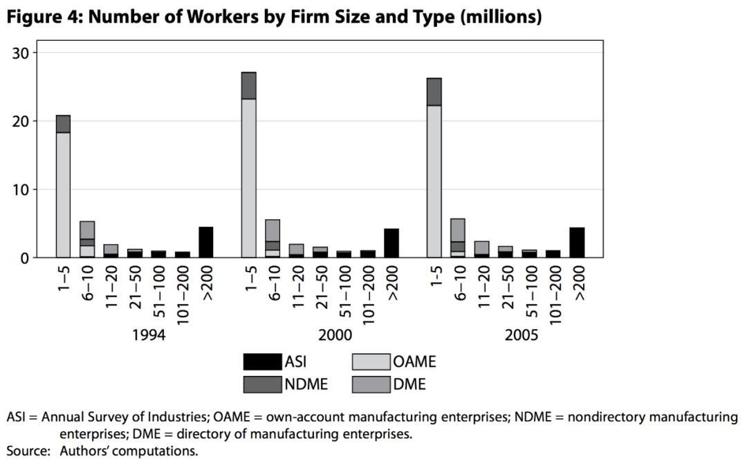 同时,如果看印度的制造业统计图,会发现有90%的“公司”其实都是一家几口齐上阵的小作坊。而且,印度发展制造业,在法律上有枷锁:比如著名的MGNREGA,即圣雄甘地农村就业保障法,就承诺为每个申请人在当地提供100 天的非熟练就业机会,如果15 天内不解决就业,政府还必须提供一定的失业津贴。