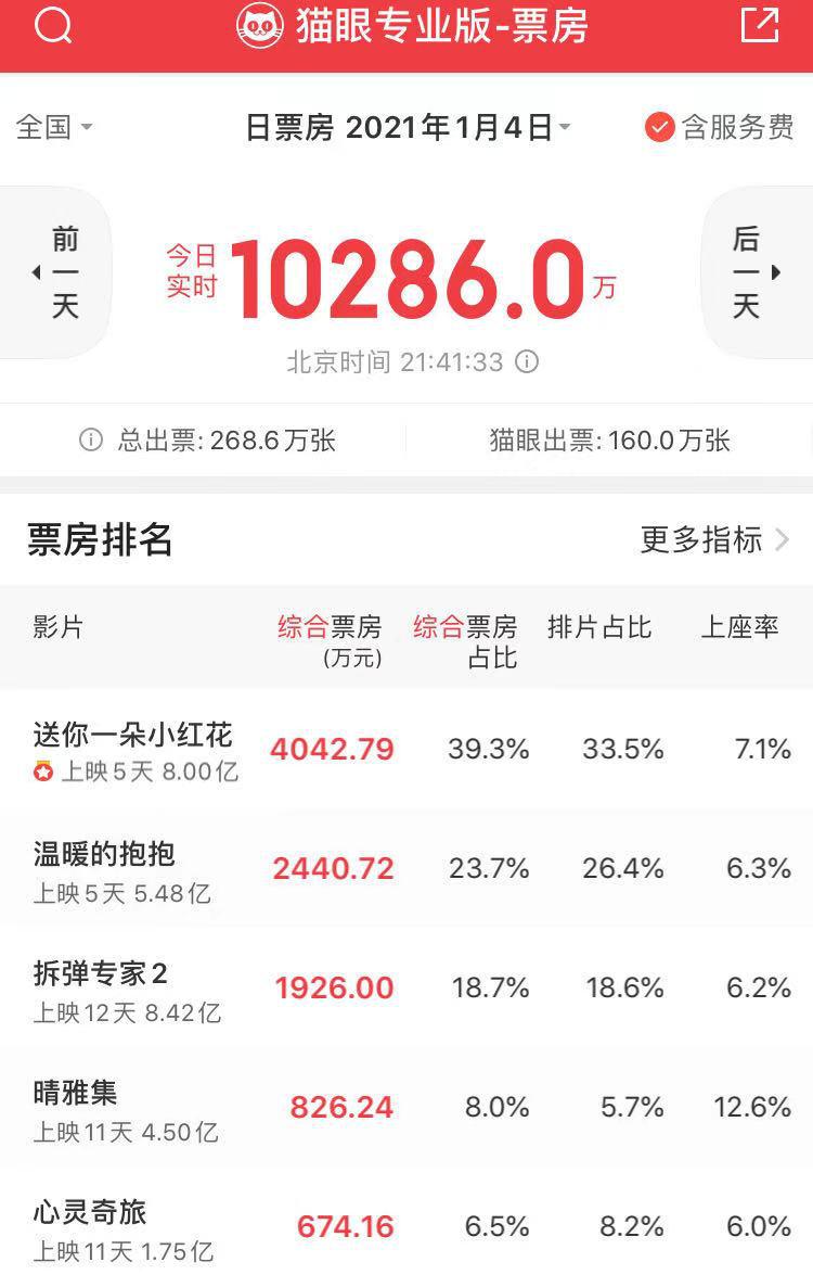 截至写稿时间,1月4日票房大盘超过1亿,虽然相比假日期间有所回落,但是放在工作日大盘中横向对比,情况已经超出预期,元旦档的热度似乎还未消散。而今天票房市场依旧由《小红花》完成领跑,该片单日票房回落至4000万左右,但累计票房已经超过8亿,《温暖的抱抱》单日票房下跌至2000万左右,累计票房达到5.4亿,而老片《拆弹专家2》占据一部分市场,虽然走势不如新片,但是累计票房已经超过8.36亿。