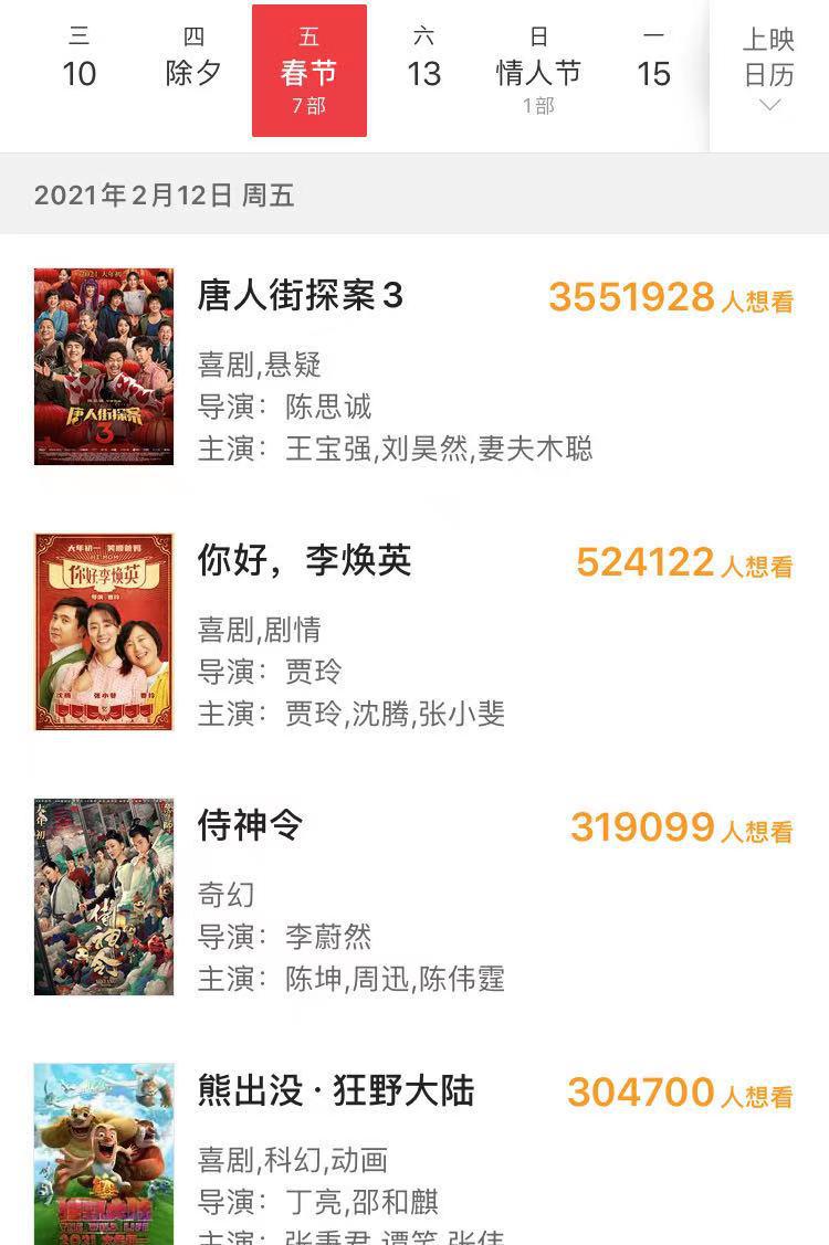 而元旦档的火热,为公众对于1月后春节档的关注进一步升高。目前以影片市场热度而言,春节档7部电影已经会出现一定的梯队分层。猫眼数据显示,《唐人街探案3》(以下简称《唐探3》)作为去年春节档唯一留存的种子选手,热度一马当先,作为第一梯队,想看人数达到355万,这个数据即便是放在往年的春节档队伍也让人咋舌。