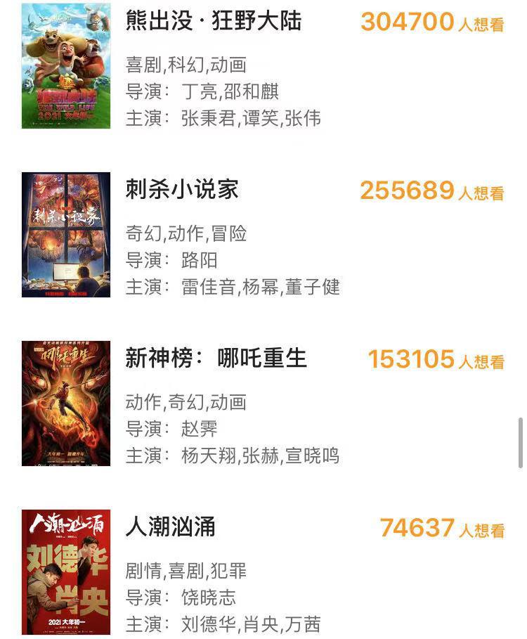 第二梯队则是《你好,李焕英》,贾玲自导自演的首部电影作品,演员阵容上邀请了沈腾作为搭档,可以算是市场好感度最高的两个TOP喜剧演员的合作,受题材红利的影响,该片想看人数达到了52.3万。