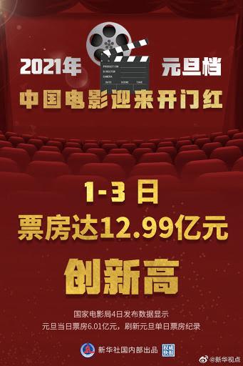 国家电影局1月4日发布数据显示,2021年元旦档(1月1日-3日)三天累计票房达到12.99亿,打破了2018年创造的12.71亿元档期票房历史纪录,其中元旦单日票房达到6.01亿,同比增长107.12%,刷新2018年创造的3.68亿元旦单日票房纪录。