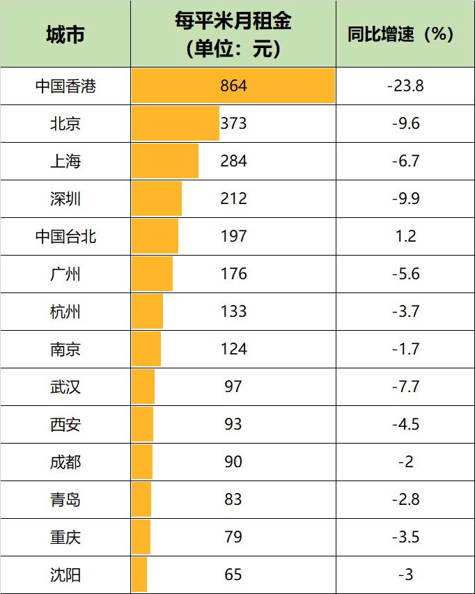 紧随其后的是武汉、西安、成都、青岛、重庆、沈阳,每平米月租金在65-97元。