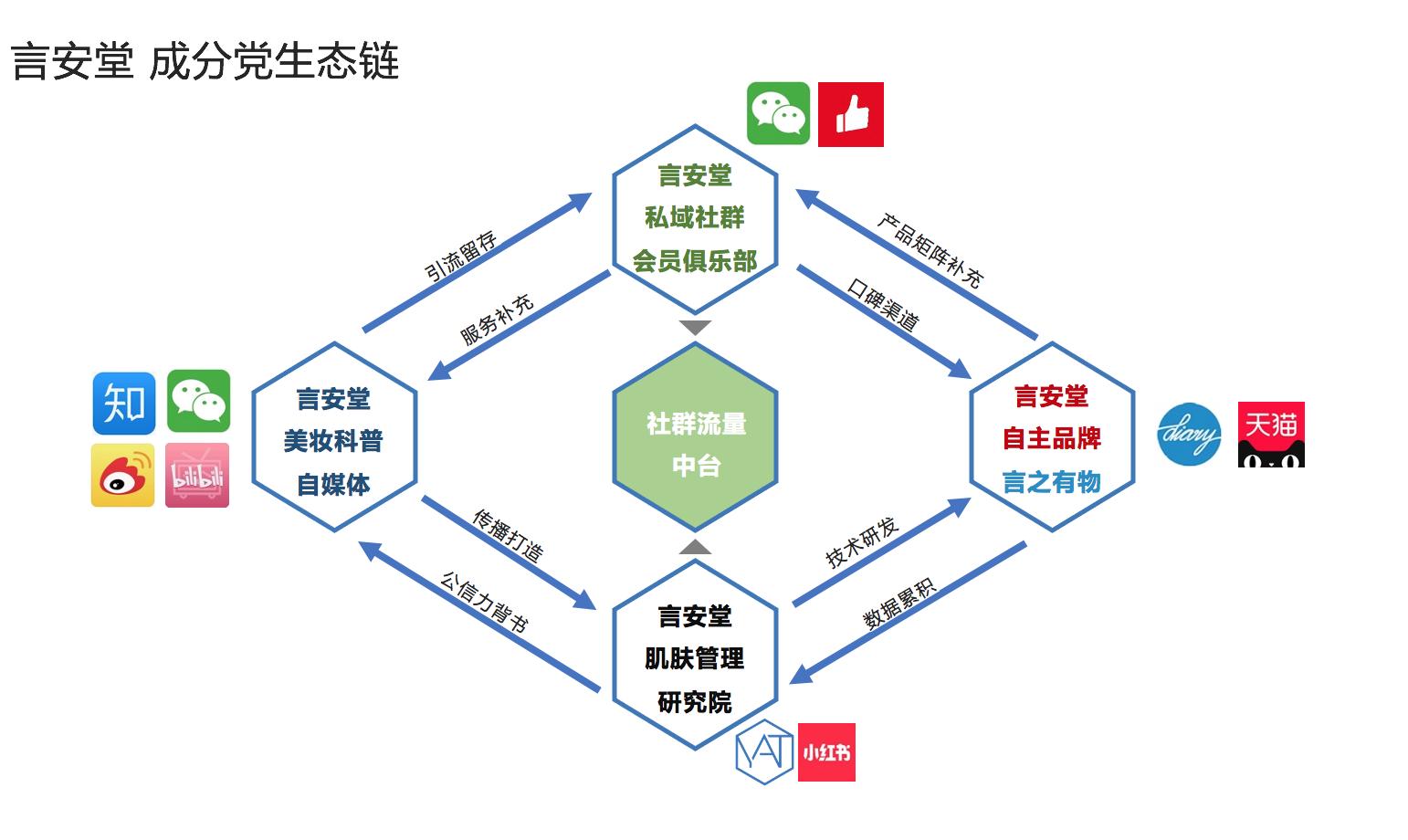 在创始人赵国庆看来,现有多元化传播形式和渠道及社交分享带来的优势,将吸引更多人信赖成分,这对品牌形成口碑和提高复购也提出了更高的要求。言安堂的核心壁垒在于已经通过自媒体和社群与用户建立起深度互动,并通过对用户的精细化运营获取数据,指导品牌产品研发。据悉,言安堂在全网有约200w的粉丝,会员数达到20w,自主品牌年GMV约6000万。未来言安堂将通过成分党生态,建立百万女性肌肤数据的数据库,连接消费者和品牌。