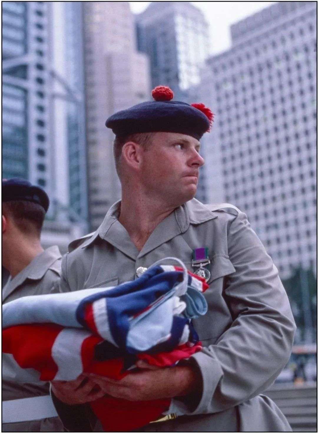 但彼时,严志刚只是个小报的记者,该如何表达这历史性的一幕?最终,他选择了降旗的一刻,这意味着一个时代的结束。然后他又抓住了英国士兵依依不舍的眼神,短短的一瞬间,他还记得他用50毫米、1.8的镜头,“啪”地按下快门。