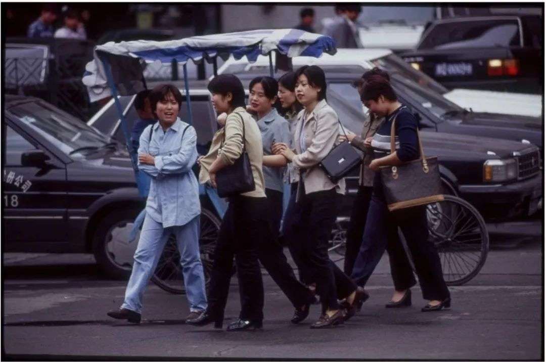 △1999年,北京街头。一群女孩从小汽车和三轮人力车旁经过,唧唧喳喳准备去逛街。看看她们的穿着和身上背着的各式小包,这就是那个时代职业女性的典型形象