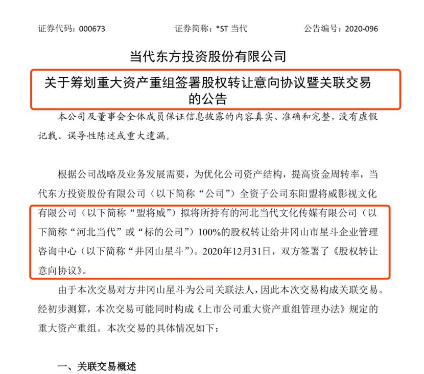 当代东方于12月31日公告,子公司盟将威拟将所持有的河北传媒100%的股权转让给星斗企业,双方于当日签署了《股权转让意向协议》。