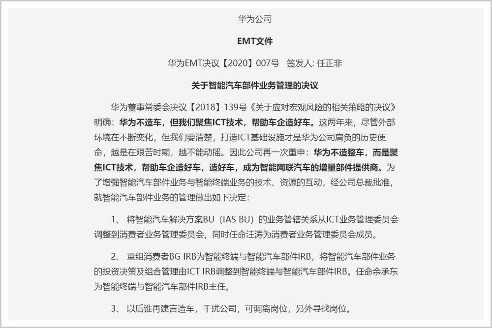 当天下午,华为在心声社区刊出了一份名为《关于智能汽车部件业务管理的决议》的内部文件,文件再度重申:“华为不造整车”。结尾处还放了一句狠话:“以后谁再建言造车,干扰公司,可调离岗位,另外寻找岗位。”