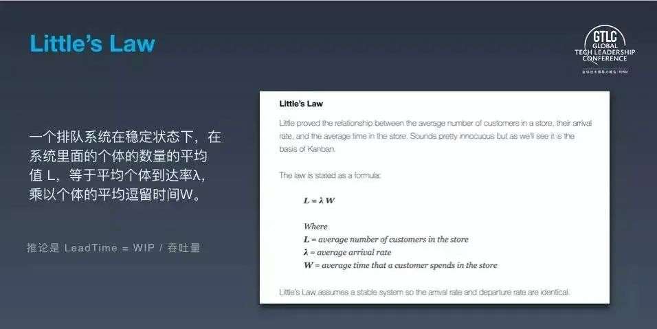 另外,我们很多时候通过排 story points 等方法,追求对研发资源的利用率,把产品、开发、测试、设计等各个团队的工作都排得满满当当。这种做法是不是就会提高效率呢?我们可以看看下面这个排队理论里面的数学原理,叫做“Little's Law“。