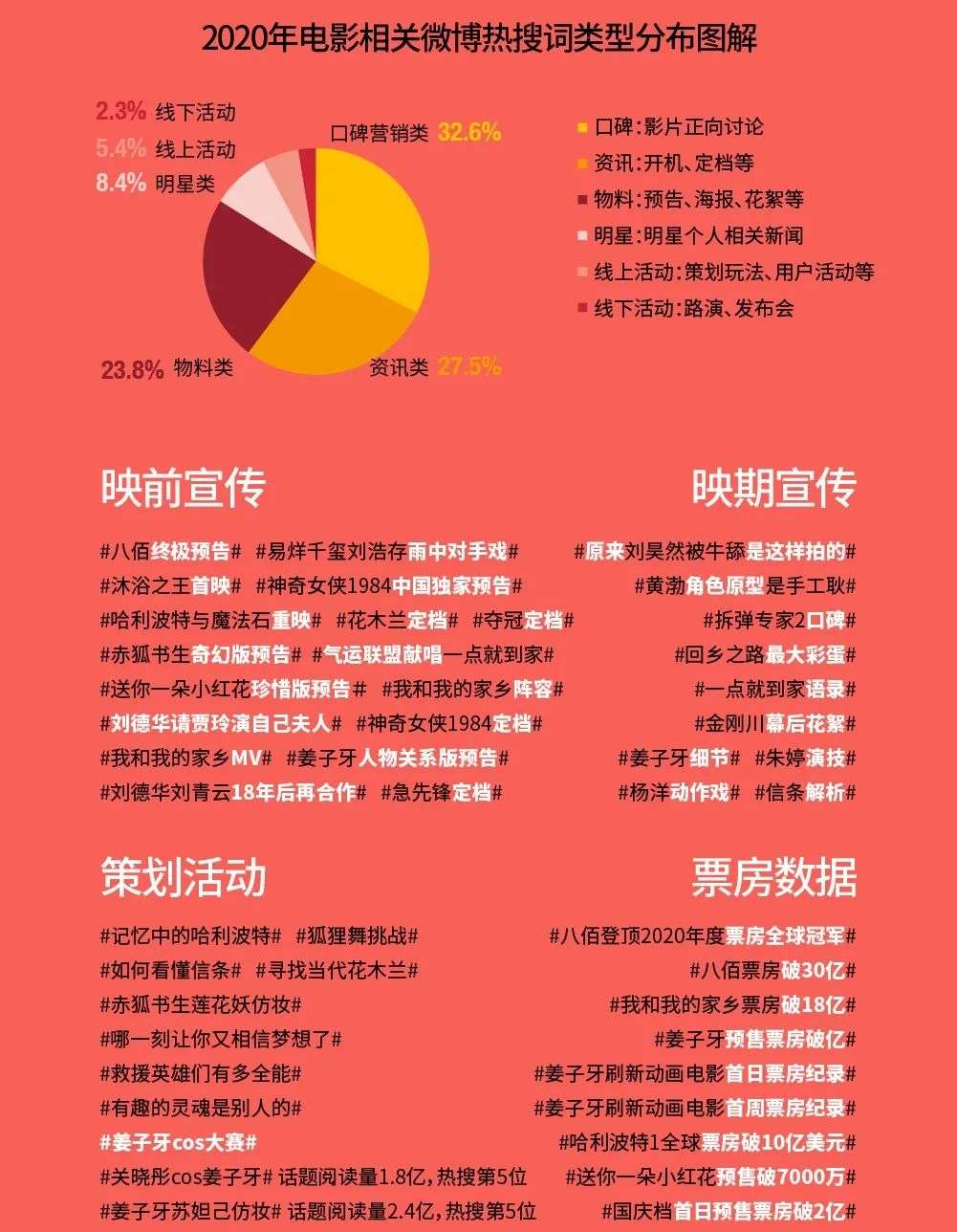 微博在《八佰》《姜子牙》《我和我的家乡》等影片的映前宣传、映期宣传、策划活动、票房数据等多个营销环节都发挥了重要作用,其中映前宣传环节更侧重定档信息的释放和预告、宣传片、MV等多元物料的推送,在观众群体中为影片打下基础认知;映期宣传更侧重对演技、精彩片段、深度解析的突出,以此加速口碑释放;策划活动则更强调趣味性与参与性,为影片吸纳更多潜在用户。