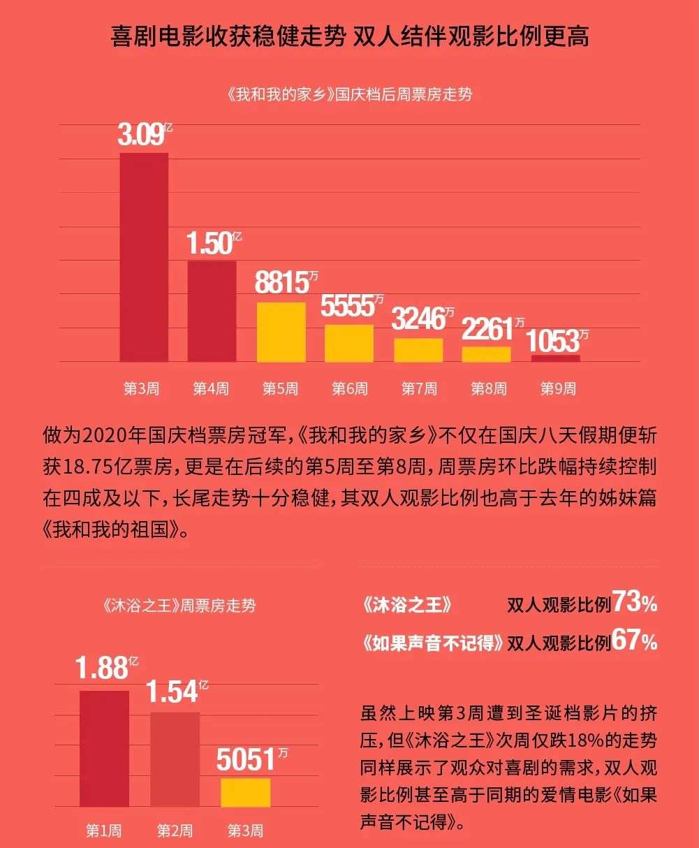 复工后观众积压观影需求的释放,是行业快速回归正轨的动力之一。猫眼报告显示,在《八佰》等影片的带动下,暑期档复工第六周即迎来了报复性观影,最终2020年暑期档总票房报收36.16亿;而原春节档影片《夺冠》《姜子牙》等“转场”国庆档,也在特殊时期催生了“返乡潮”,推动国庆档票房攀升至39.67亿。