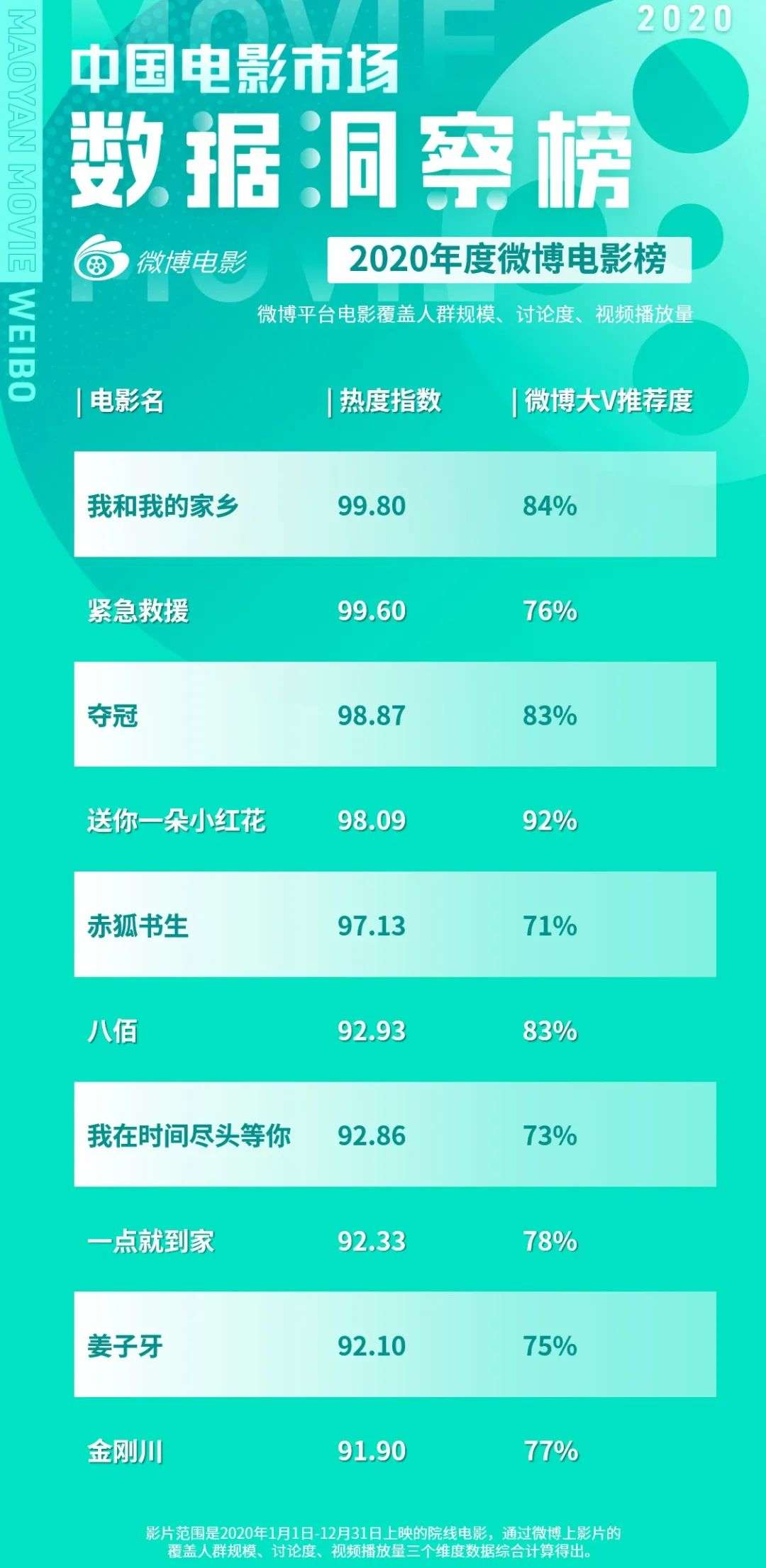 猫眼数据洞察榜「2020年微博电影榜」显示,《我和我的家乡》在微博获得了84%的大V推荐度,KOL群体的口碑传播有效推动了影片的票房转化。