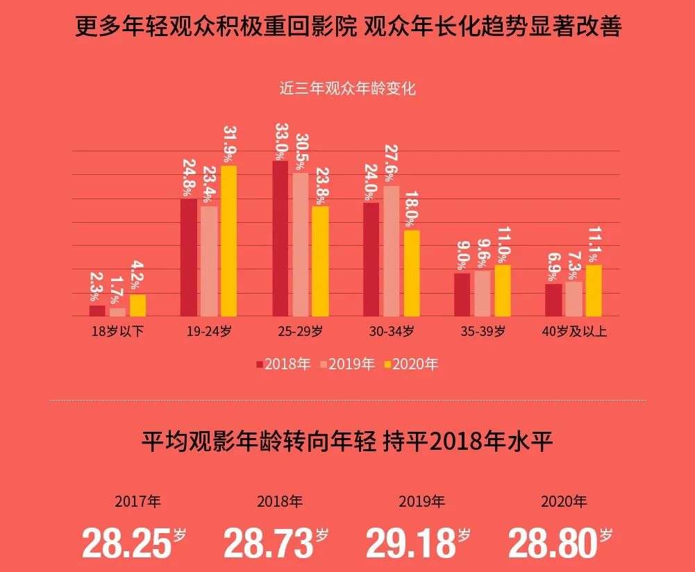 特殊时期的报复性观影热潮中,往年低频、中频观影用户在2020年复工后增量用户群体中占比提升,其中年轻观众的贡献不可忽视,猫眼报告显示,2020年观众结构中观影平均年龄更年轻了,19至24岁观众占比显著提升。年轻观众积极重回影院,不仅在于他们需要影院难以替代的优势满足自身社交需求,也源于其对电影本身的热爱。
