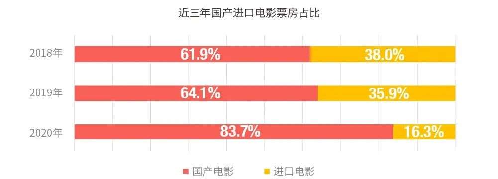 从猫眼报告来看,2020年国产片的市占率迎来了大幅提升。2018年、2019年、2020年,国产片在全年票房大盘中的占比分别为61.9%、64.1%、83.7%。市场此消彼长,同期进口片票房占比一路走低。