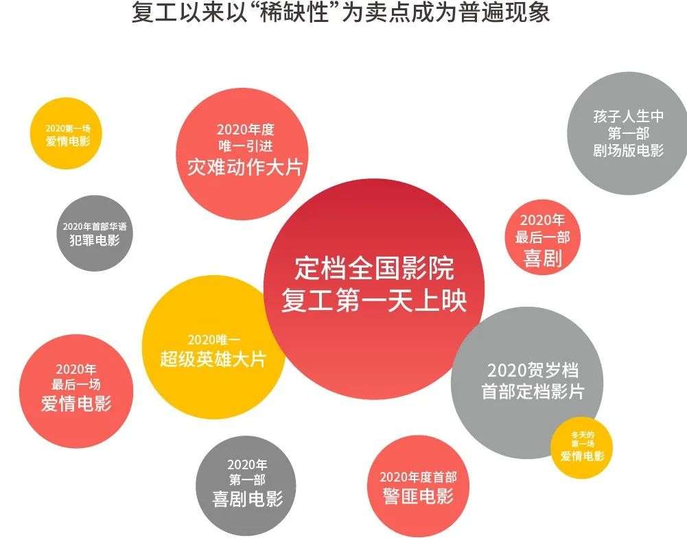 《2020电影市场数据洞察》显示,复工以来,以“定档全国影院复工第一天上映”、“2020唯一超级英雄大片”、“2020年首部华语犯罪电影”等稀缺属性作为卖点成为了影片宣传的普遍现象。阔别院线半年,国产大片、科幻、犯罪、喜剧等所有内容题材对观众而言都成为了稀缺题材,这是由特殊时期的市场刚需决定的。