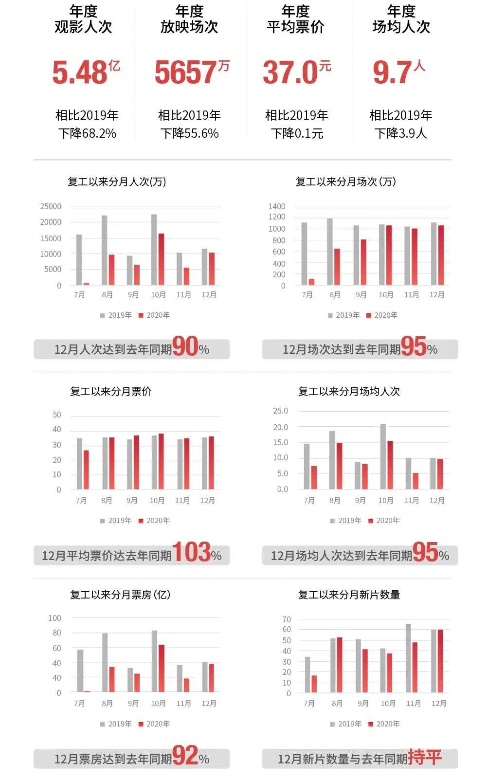 猫眼报告显示,2020年12月行业分月人次、分月场次、分月均场人次、分月票房均达到了2019年同期的90%以上,此外,12月新片数量与2019年同期实现持平,分月票价达2019年同期的103%。最终,国内电影市场复工后收获了180.61亿的总票房。