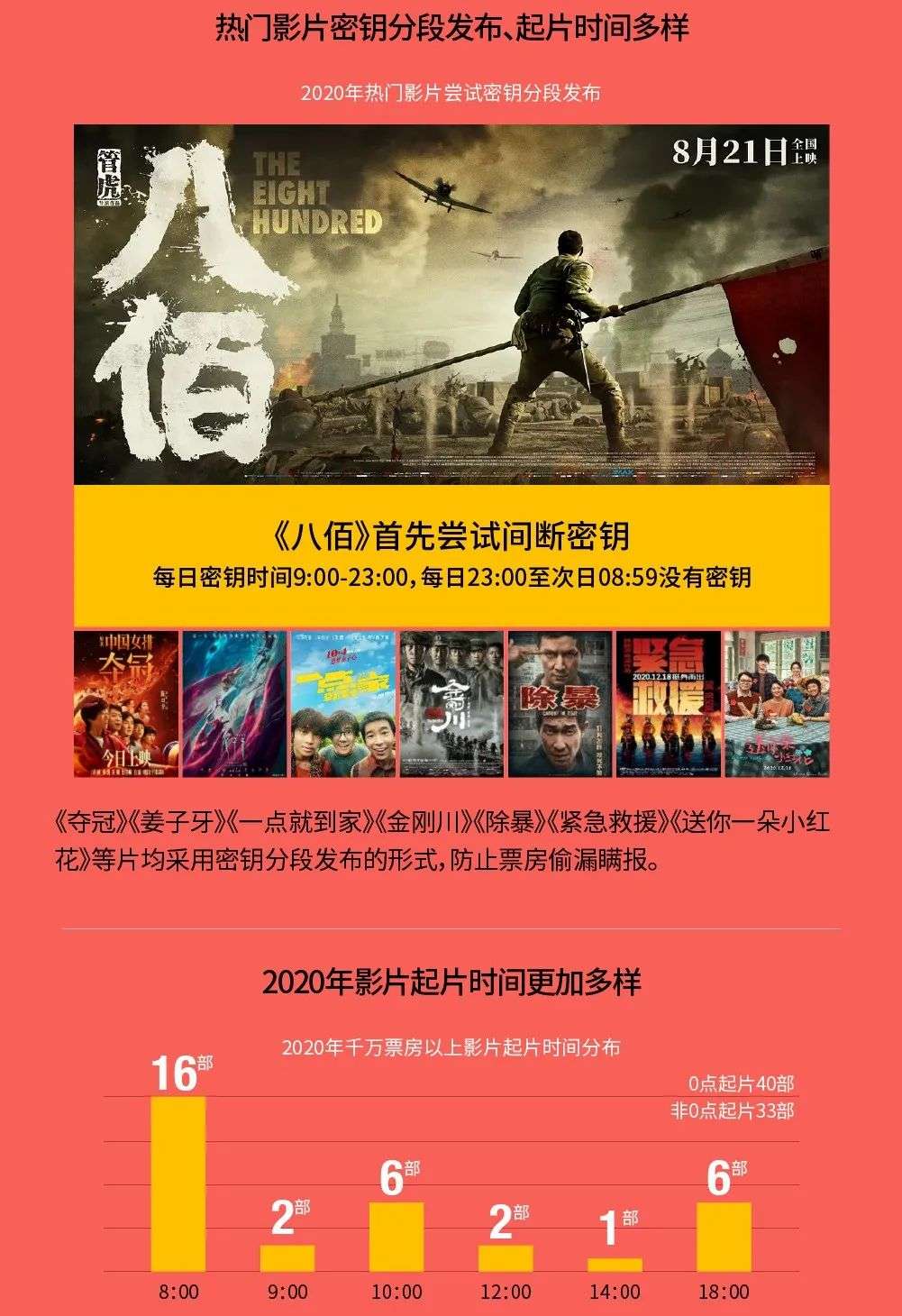 发行层面,2020年影片发行操作更为精细。猫眼报告显示,在《八佰》首先尝试“每日密钥时间9点至23点,每次23点至8:59没有密钥”的分段发行后,《夺冠》《姜子牙》《金刚川》《送你一朵小红花》等影片均采用了间断密钥形式。此外,发行方对影片上映时间也进行了更为精细的定制,2020年千万票房以上影片起片时间涉及8点、10点、14点等多时间段。