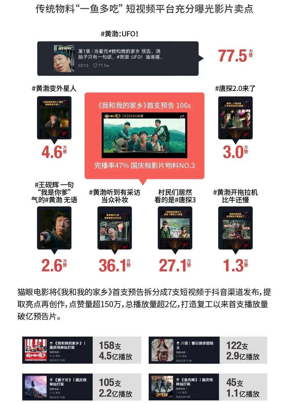 与抖音实现深度合作的猫眼,也深谙这种“拆解式传播法”,《我和我的家乡》上映前,猫眼电影将其首支预告拆分成了7支短视频于抖音渠道发布,提取亮点再创作,最终打造了2020年复工以来首支播放量破亿的宣传片。