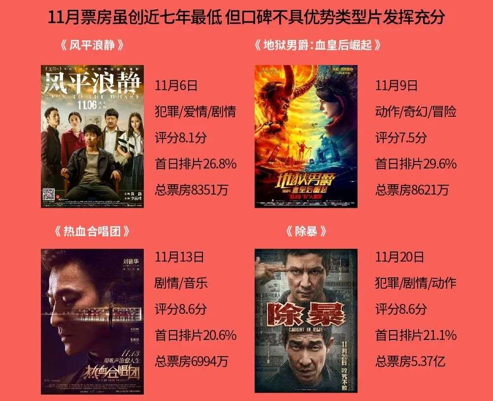 2020年,类型片在冷档期的表现很是火热。猫眼报告显示,2020年11月票房虽创近七年最低,但类型片却实现了充分发挥,如《除暴》《风平浪静》《热血合唱团》等,其中犯罪片《除暴》获得了5.37亿票房,较为小众的《风平浪静》与《热血合唱团》分别获得了8351万票房和6994万票房。