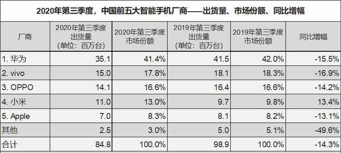 IDC数据显示,2020年第三季度,小米出货量4650万部,较去年同期增长42%,市占率超越苹果达到13.1%,时隔6年重回全球前三。而国内排名前五的厂商当中,唯独小米一家企业获得了13.4%的正增长,其余四家均出现同比下滑。随着新款旗舰手机小米11正式发布,小米高端化战略再下一城。