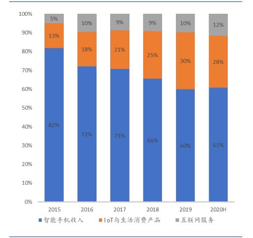 从收入构成上看,从2015年到2020年上半年,小米手机业务收入占比由82%下降至61%,IoT与生活消费产品占比由13%提升至28%,互联网服务收入占比则由5%提升至12%。