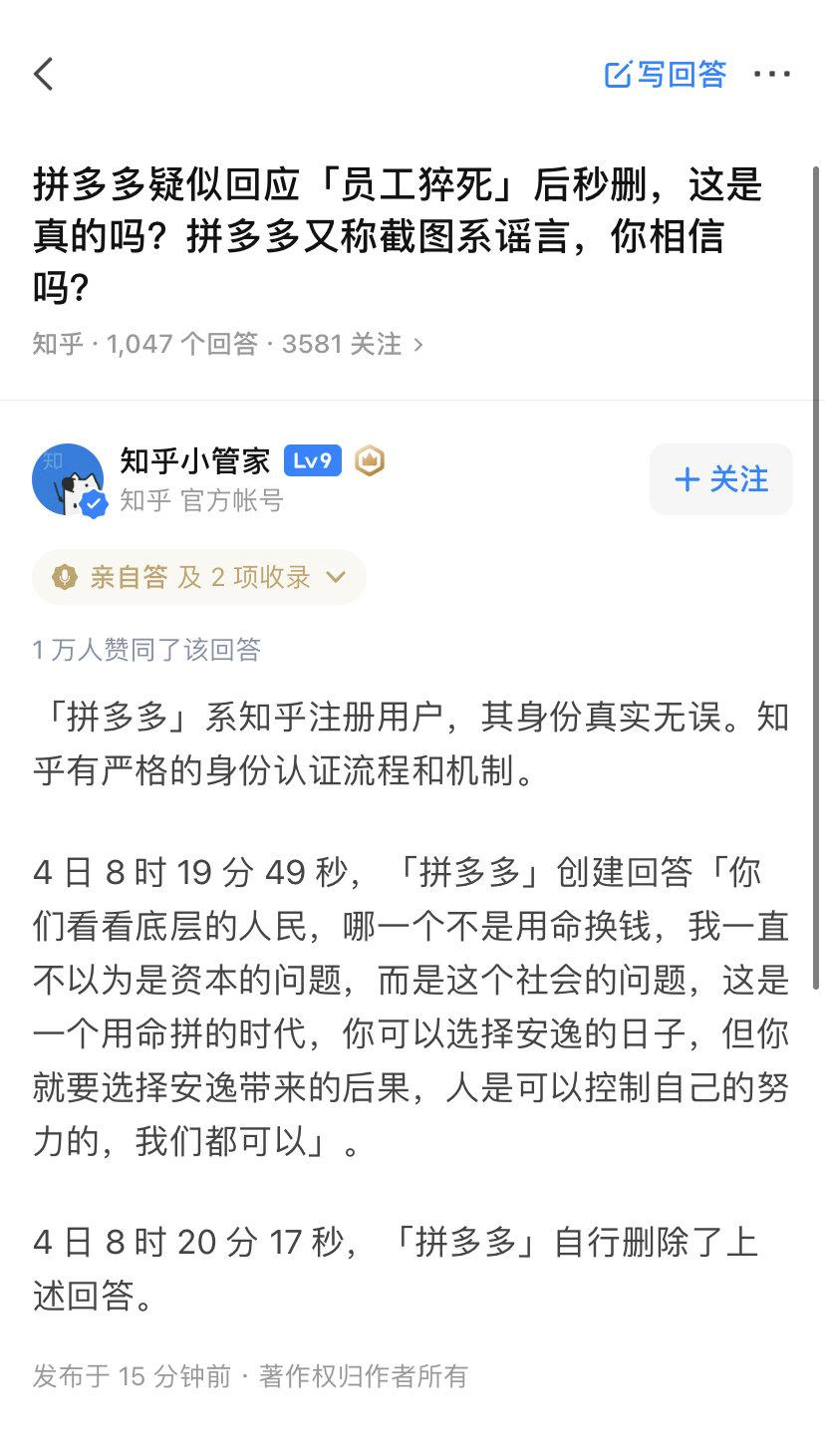 对于知乎的硬核打脸,拼多多补发声明表示,经排查,该内容系拼多多营销合作供应商员工李某某在地铁上翻看新闻,想要发表一下自己的想法,于是用手机客户端进行了回复。回复后,李某某发现发布账户为此前登录留存的机构账号,于是立即进行了删除处理(从发布到删除,间隔不到30秒),该言论不代表任何拼多多官方态度,也未获得任何授权。拼多多官方对该言论表示强烈反对,并暂停了与该供应商合作,修改密码回收账户,并将进一步追究相关人员责任,并附上了李某某的陈述。