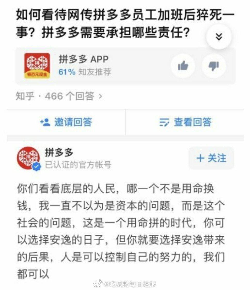 “你们看看底层的人民,哪一个不是用命换钱,我一直不认为是资本的问题,而是这个社会的问题,这是一个用命拼的时代。”1月4 日,拼多多在知乎上官方账号这样一则发言的截图在网上引发了热议。