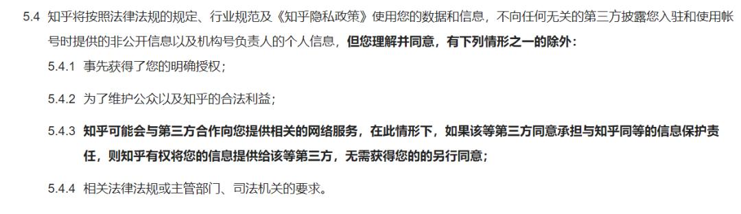 对于知乎“正面刚”的行为,有网友表示,这是否牵涉到平台侵犯了用户的隐私权。其实,知乎用户协议的5.4条或可解决这一疑问——此举是基于维护公众的知情权以及自身的合法权益。但对于公众所提出的个人隐私的相关质疑,平台方并没有给用户一颗“定心丸”,这或为此后平台的发展埋下了隐患。
