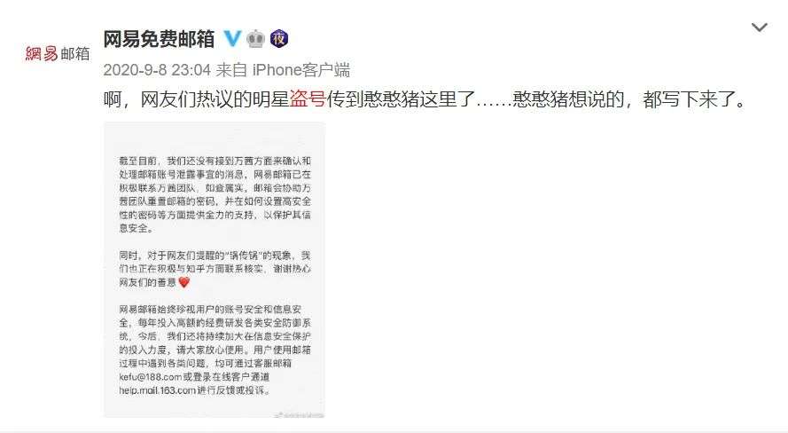 由于知乎的回应牵涉到了注册账号方,网易邮箱也回应了万茜被盗号事件,称“截至目前,我们还没有接到万茜方面来确认和处理邮箱账号泄露事宜的消息,已在积极联系万茜团队,如查属实,邮箱会协助万茜团队重置邮箱的密码。”因此,该事件的真相究竟是什么,不得而知。