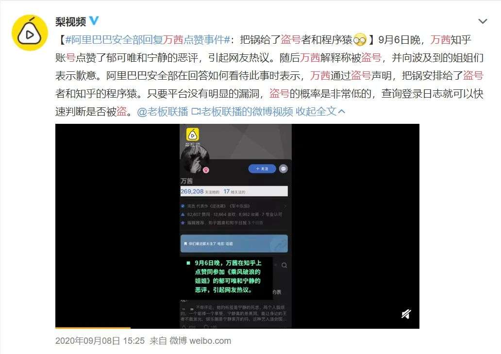 但这一招,在知乎身上并不适用,追溯到去年9月万茜点赞宁静、郁可唯黑帖事件,当万茜方回应是盗号时,这是以抹黑平台为代价为自己辩白。毕竟,这一回应背后的深意是知乎这一平台上用户的账号安全难以保障。