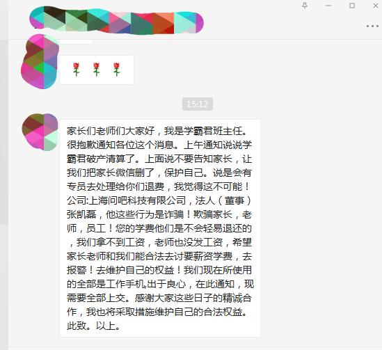 “家长们老师们大家好,我是学霸君的班主任,很抱歉通知各位这个消息。上午通知说学霸君破产清算了。上面说不要告诉家长,让我们把微信删了,保护自己。说是会有专员去处理给你们退费,我觉得这不可能!……您的学费他们是不会轻易退还的,我们拿不到工资,老师也没发工资,希望老师家长和我们能合法去讨要薪资学费……”这是一个班主任在学生群发的信息,不少家长因此才得知学霸君出事的消息。