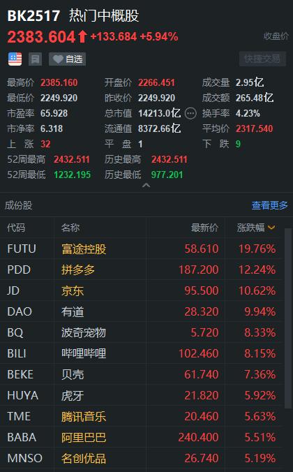 热门中概股中,拼多多、京东、B站齐创新高,拼多多市值超京东百度之和。阿里巴巴涨5%。