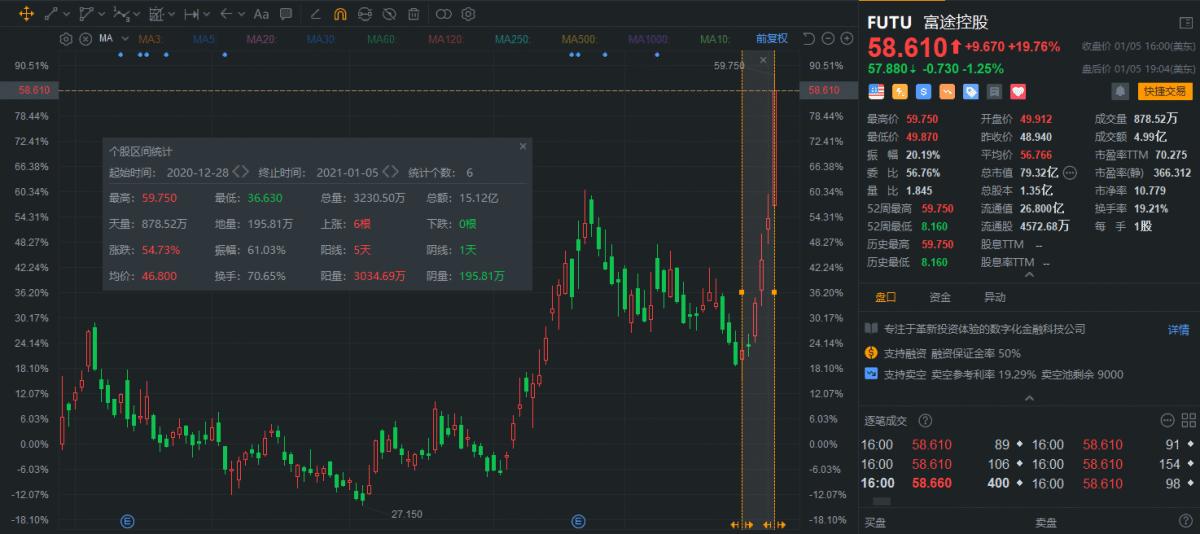 富途控股涨近20%,六日累涨超50%