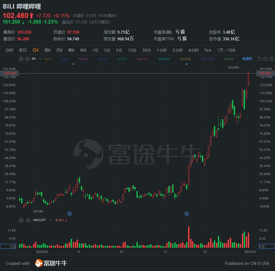 周二$哔哩哔哩(BILI.US)$收涨8%,股价首次收于100美元上方,报102.46美元。自公布三季报以来,B站累涨114%,市值356亿美元。