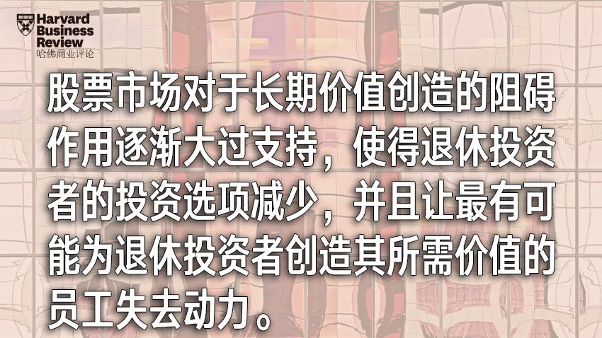 公司上市演说和资本市场不会灭绝。不是所有投资者都能着眼长远,而且很多行业也许不可能实现新模式。但股票市场对于长期价值创造的阻碍作用逐渐大过支持,使得退休投资者的投资选项减少,并且让最有可能为退休投资者创造其所需价值的员工失去动力。本文提出的新模式可以更好地满足这些关键利益相关者的需求。