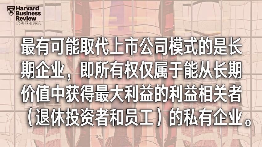 我认为,最有可能取代上市公司模式的是长期企业(long-term enterprise,简称LTE),即所有权仅属于能从长期价值中获得最大利益的利益相关者(退休投资者和员工)的私有企业。