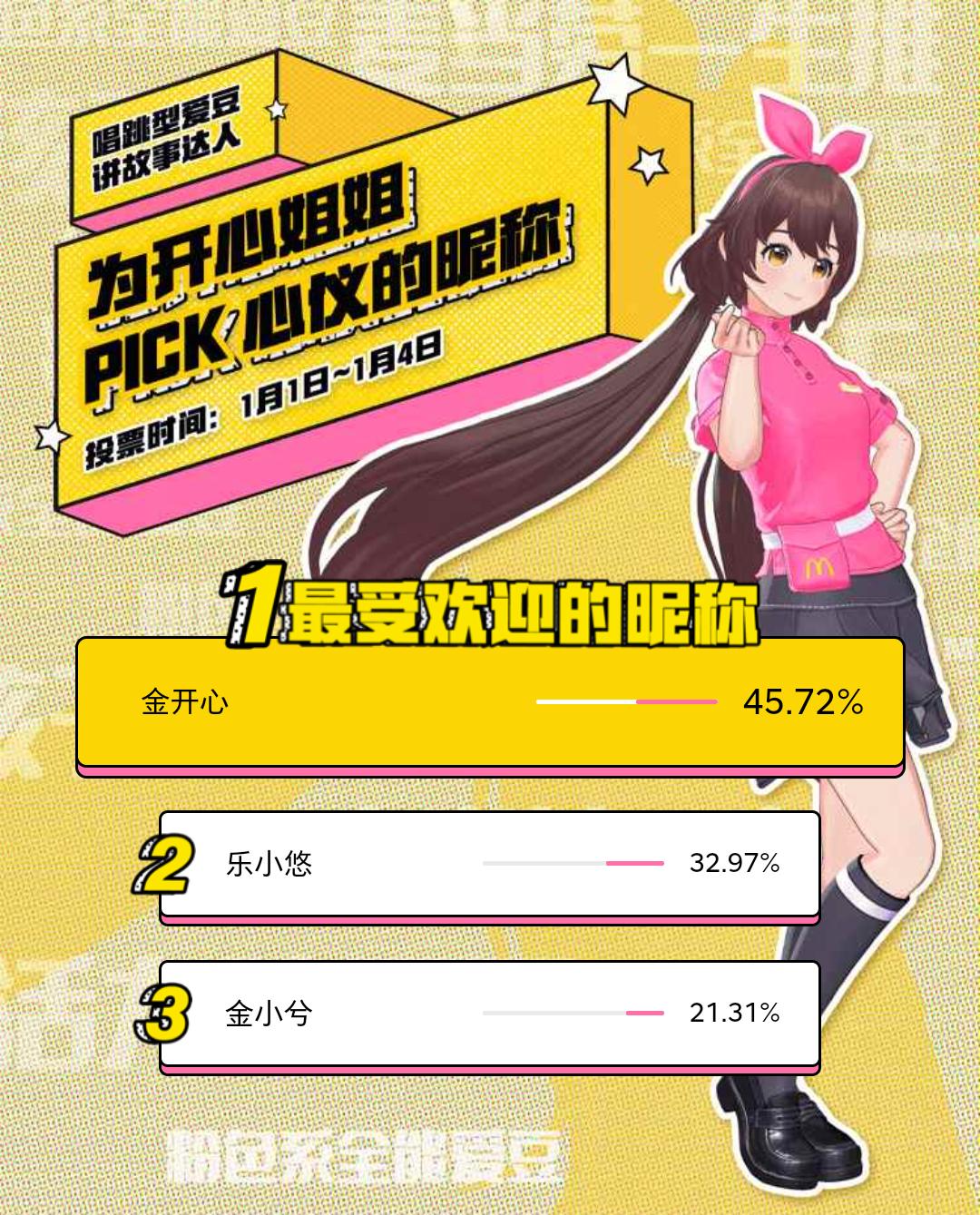 从麦当劳的官宣界面中可以看到,除了唱跳型爱豆、讲故事达人以外,还有如粉色系全能爱豆、活力孩子王和麦当劳一生推等标签,另外,目前的名字是开心姐姐,麦当劳发起了征名活动,之后很大概率可能叫金开心。