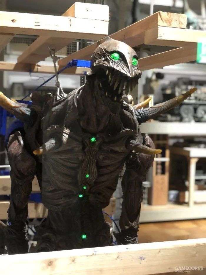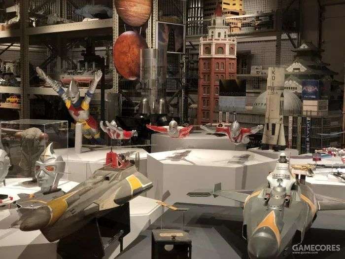 透过透明玻璃橱窗,可以看到仓库中摆放的各种特摄道具。
